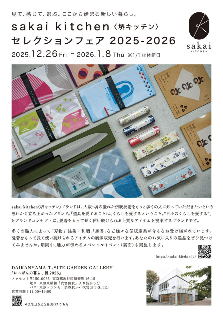 Onland Storeで8月から11月にかけてご紹介しました『sakai kitchen<堺キッチン>』が、代官山T-SITE GARDEN GALLERYの「にっぽんの暮らし展2026」にて、POP-UPイベントを開催します。